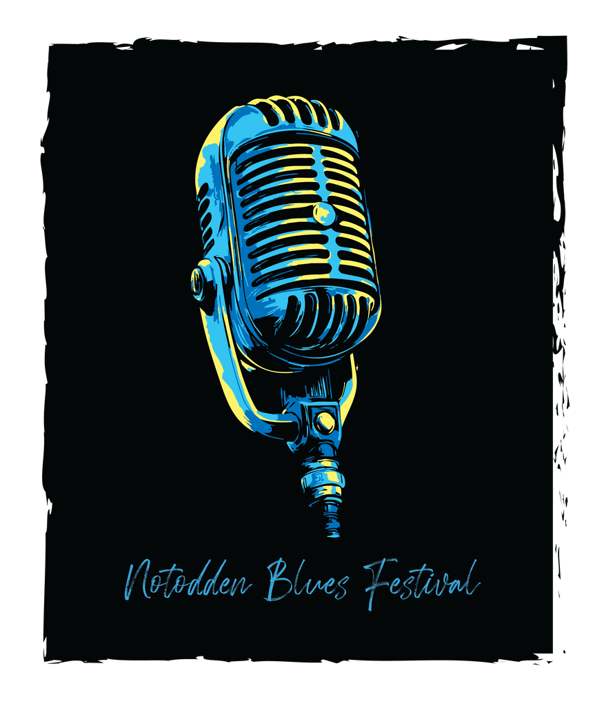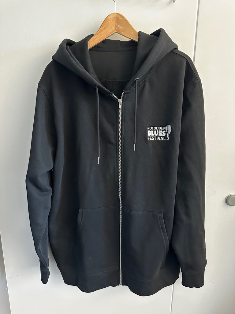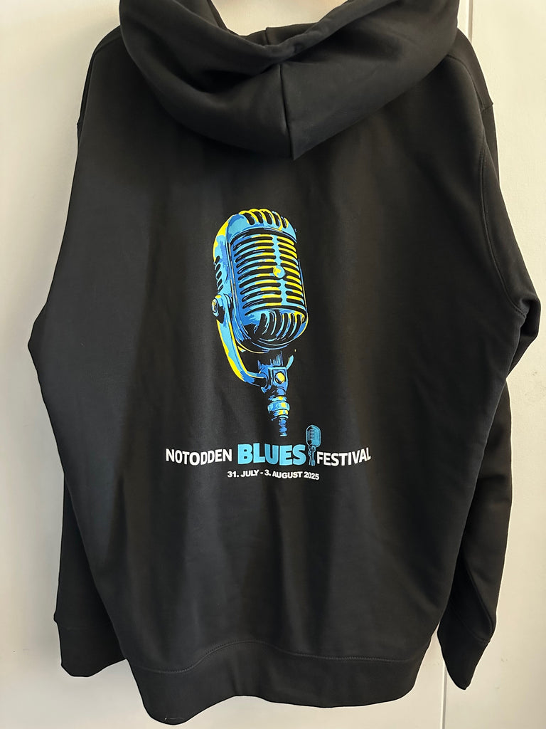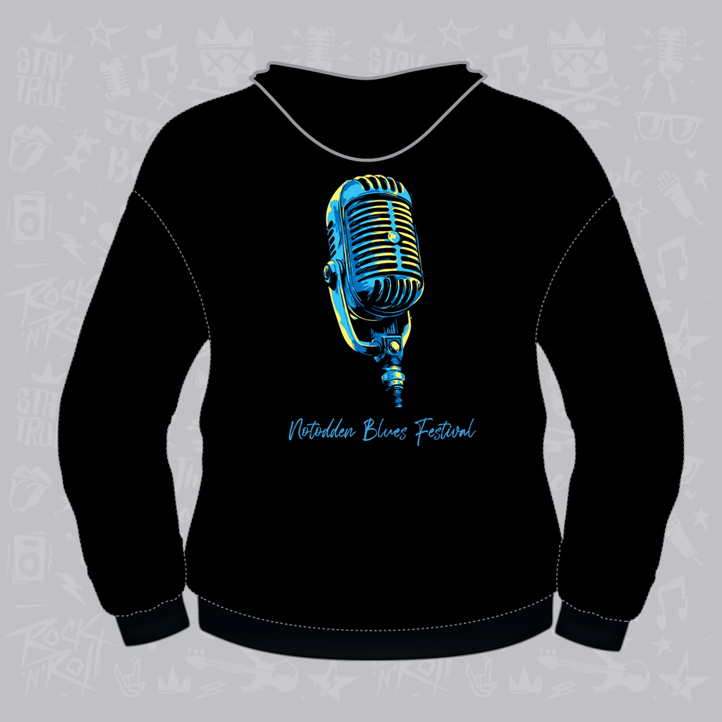 Sort hettejakke med mikrofon trykk på rygg og brodert logo på framsiden.